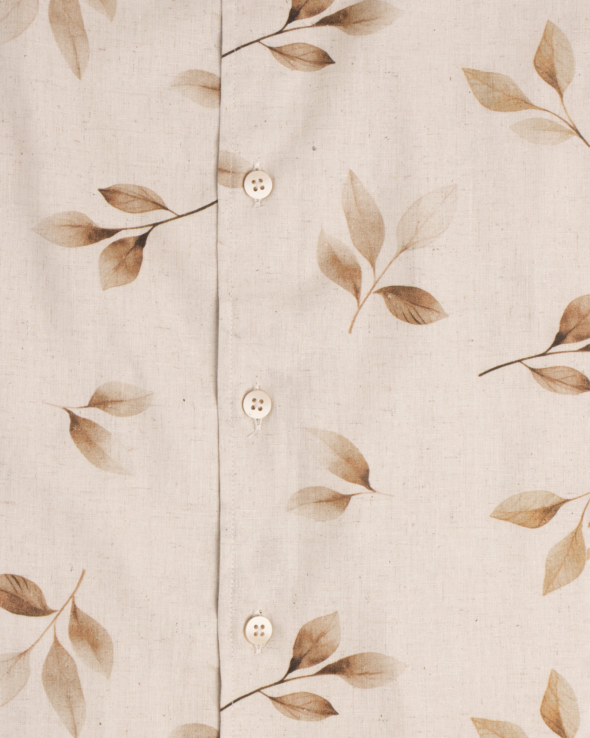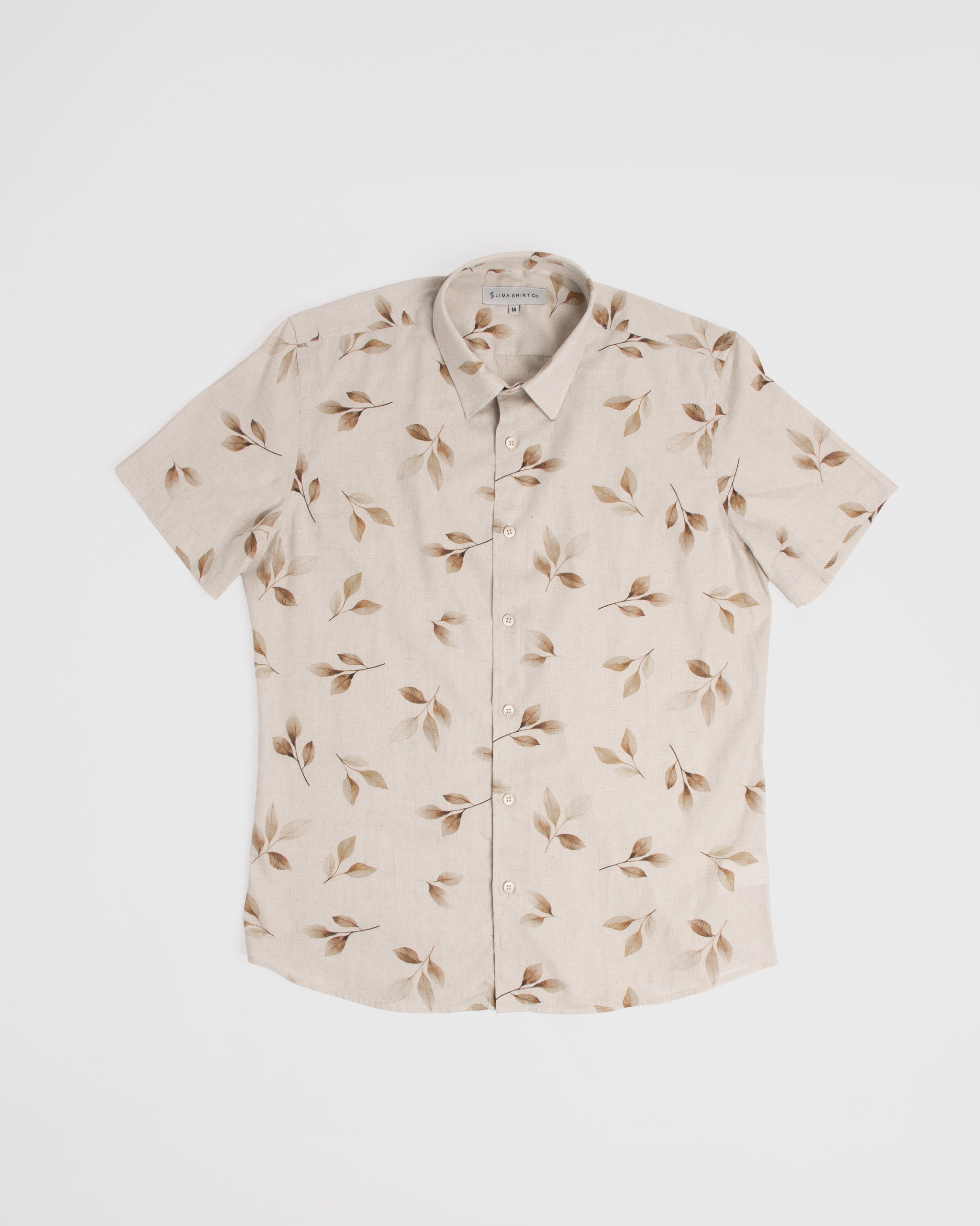Diseñada para los días de clima cálido, esta camisa de manga corta combina 70% algodón y 30% lino, logrando una prenda ligera, fresca y de textura natural. Su estampado orgánico de hojas en tonos neutros aporta un estilo relajado y fácil de combinar, ideal tanto para looks casuales como para outfits relajados de fin de semana.
